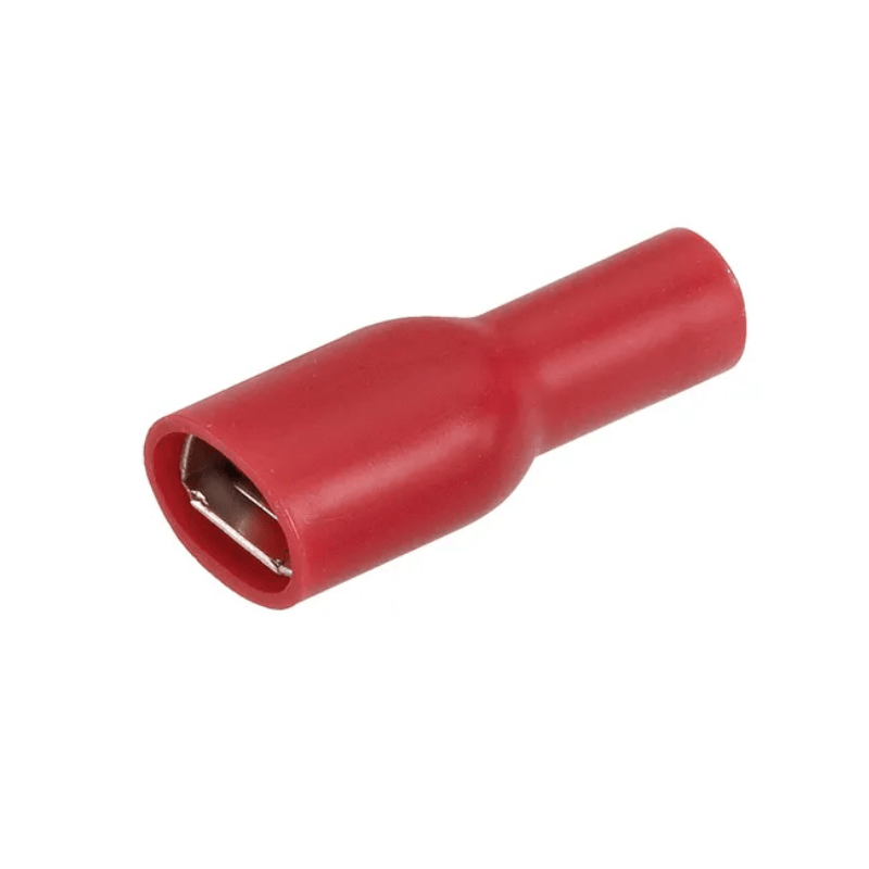 Borne à lame femelle, évasée en vinyle entièrement isolée. Diamètre du fil : 2,5-3 mm Dimensions de la languette ou du diamètre : 6,3 x 0,8 mm (1/4”)