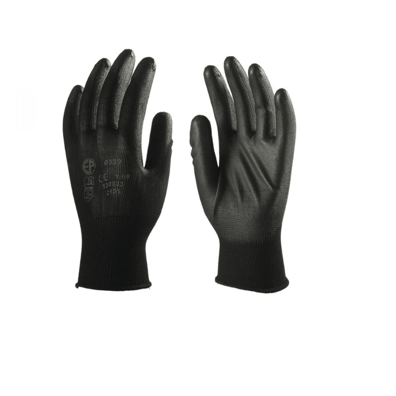 Tricoté 100 % polyester noir • Jauge 13 • Paume enduite de polyuréthane noir • Poignet élastique