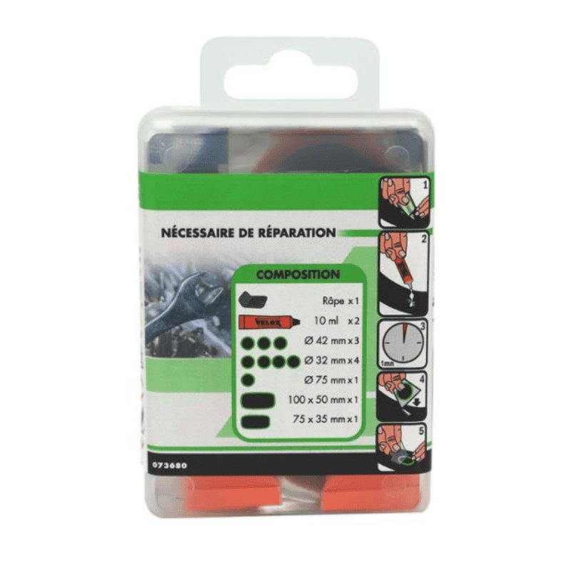 Comprend: 1 râpe – 2 tubes de dissolution 10ml – Rustines: 3 x 40mm, 4 x 35mm, 1 x 75mm, 1 100x50mm, 1 75x35mm