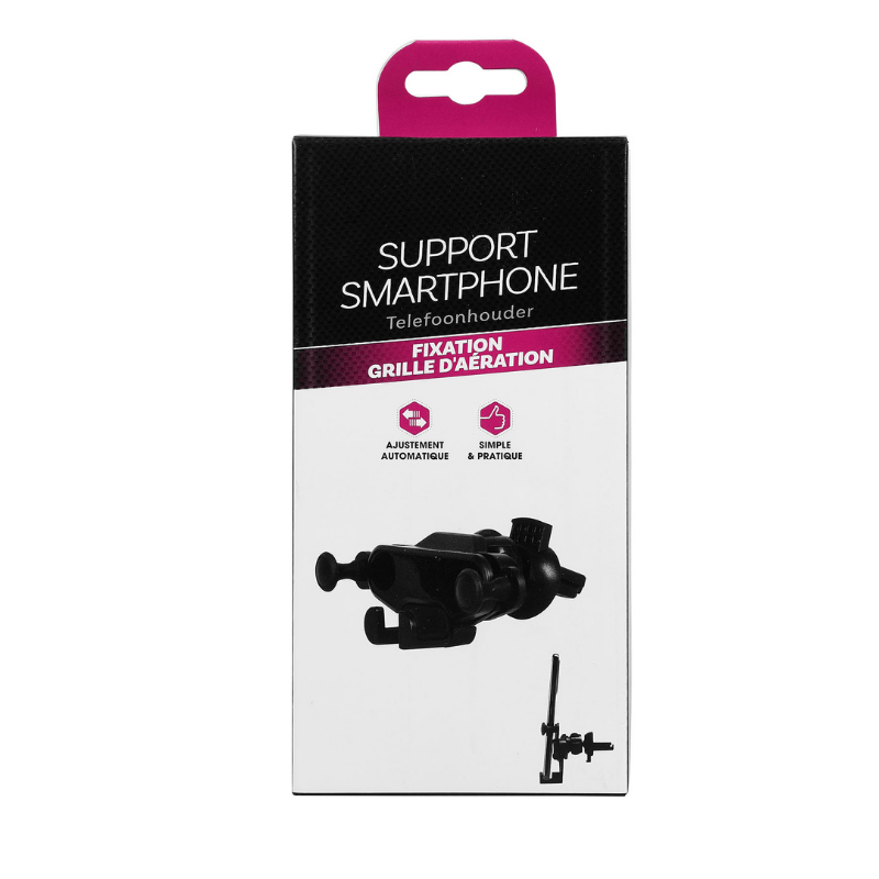 647084Fixation sur grille d’aération. Système de fixation à pince. Tête du support orientable à 360°. Les bras du support s’ajustent automatiquement à la taille du téléphone, à gravité.
